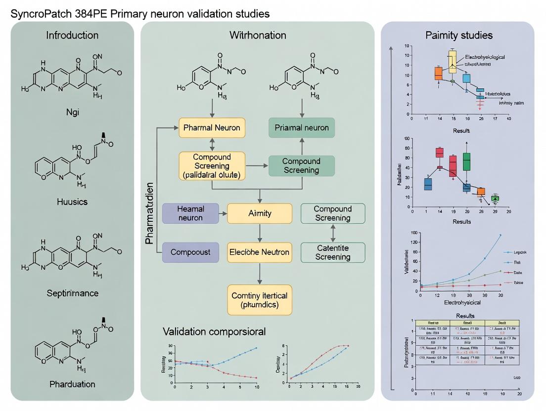 Validation studies using primary neurons on the SyncroPatch 384PE represent a transformative step in ion channel drug discovery, effectively bridging high-throughput capability with high physiological relevance. By understanding the foundational importance of native systems, mastering the specialized methodologies, proactively troubleshooting technical hurdles, and rigorously validating data against gold-standard techniques, researchers can generate exceptionally predictive datasets. This approach de-risks the pipeline for CNS and analgesic therapeutics by providing early, human-translatable insights into compound efficacy, selectivity, and mechanism of action directly in the target cell type. Future directions will involve integrating more complex co-cultures (e.g., neurons and astrocytes), employing patient-derived iPSC neurons for disease modeling, and leveraging advanced data analysis and machine learning to extract deeper pharmacological insights from rich, high-content primary cell electrophysiology data.